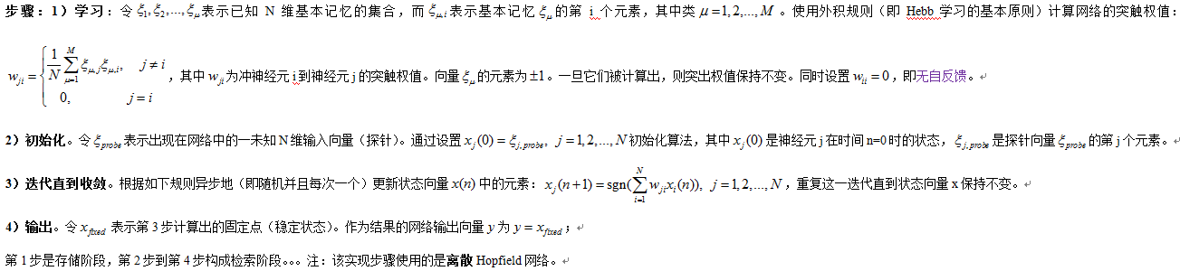 个人理解:第1步用作学习,相当于平时的模型训练,这里不用训练直接算好权值即可;第2到4步为识别过程,所谓的探针 则为识别的目标,输入到在第1步学习好的网络中,其输出的结果可以认为是对训练该网络权值的输入向量 的联想。即所谓的用于联想记忆。