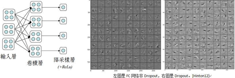 其中,降采样层、为非全连接的”虚层”,也就是说,真正构成压力的只有卷积层。Hinton的Dropout观点来看,块状神经元使得一个卷积核在一张feature map中固定学习一部分输入,而不依赖全部输入。这是为什么卷积核的可视化效果较好的原因。因为它模仿出了输入的局部特征。正则化+dropout 改善了过拟合的现象。