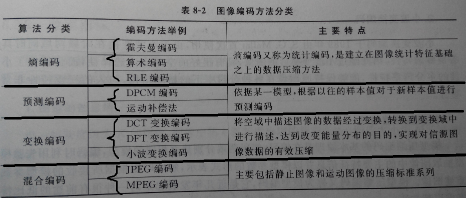 数字通信模型中有信道编码和信源编码,其中信道编码的主要任务是解决信息传输的可靠性问题。信源编码的主要任务是解决信息表达的有效性问题。而图像编码属于信源编码的范畴,目的是研究数码压缩率,即高效编码问题。图像编码方法分类如下: