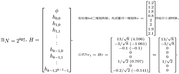 定义:哈尔变换本身对称、可分离, F是图像矩阵,H是变换矩阵,T为结果二维矩阵。由于是对的每一行作哈尔小波转换,作完后还要对的每一列作哈尔小波转换(与二维傅里叶变换一样),因此公式为:; 其逆变换为